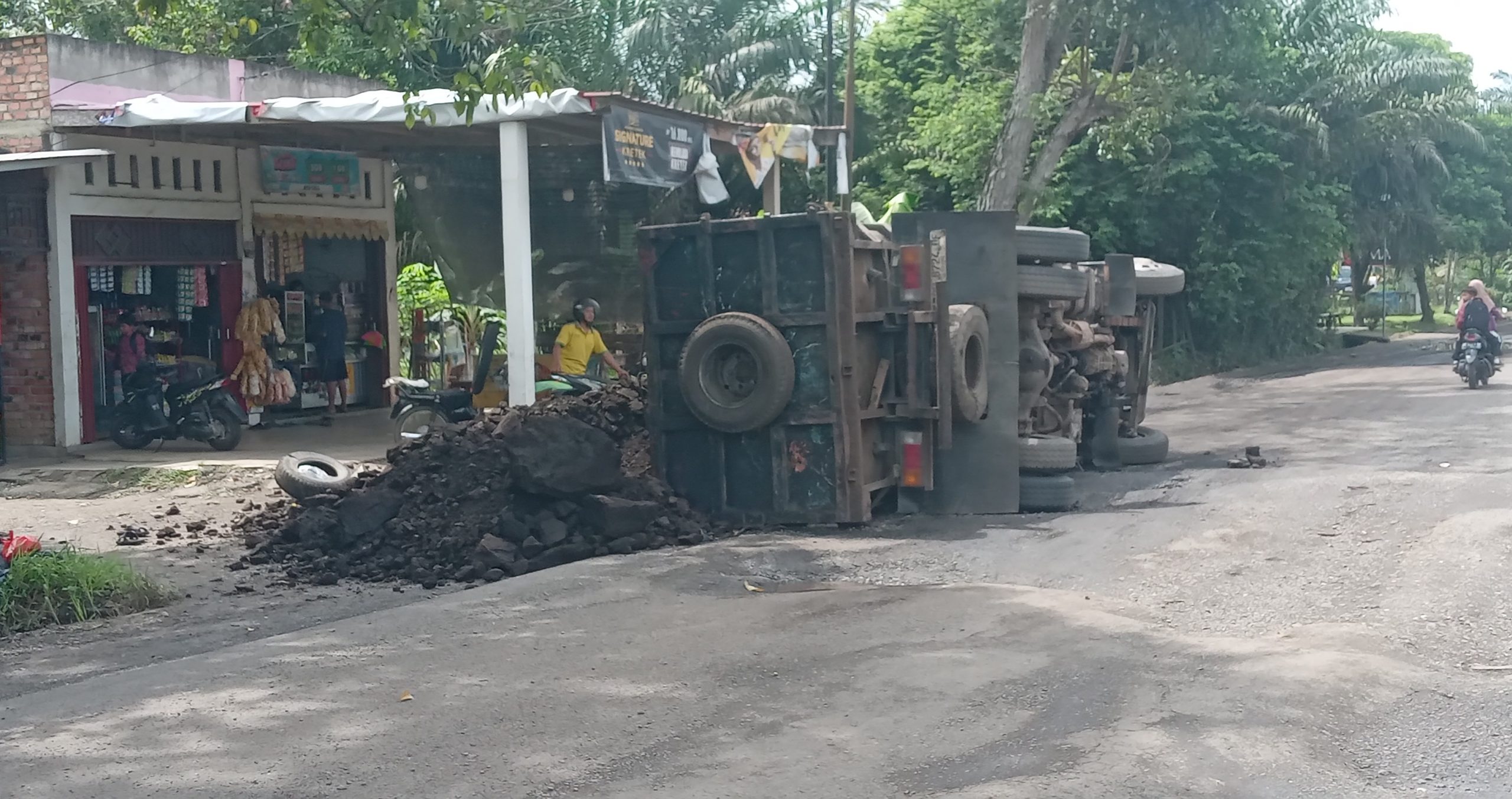 Batanghari-Kecelakaan lalu lintas kembali terjadi di jalan lintas provinsi muara bulian-bajubang tepatnya di Kilometer 5, Kecamatan Muara Bulian, Kabupaten Batanghari provinsi jambi, Sebuah truk angkutan batu bara dilaporkan terguling setelah diduga kehilangan kendali akibat kondisi jalan yang berlubang (26/2/2025).