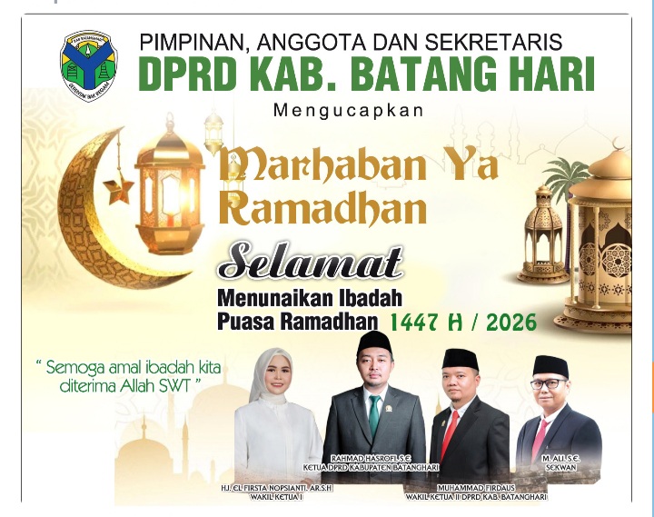 Batang Hari – Pimpinan, anggota, dan Sekretaris Dewan Perwakilan Rakyat Daerah (DPRD) Kabupaten Batang Hari menyampaikan ucapan selamat menyambut bulan suci Ramadhan 1447 Hijriah yang bertepatan dengan tahun 2026.