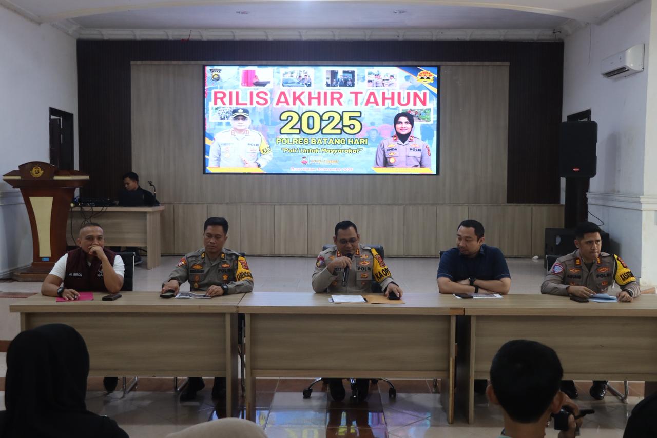 BATANG HARI – Polres Batang Hari menggelar Rilis Akhir Tahun 2025 pada Senin (30/12/2025) sekitar pukul 16.00 WIB di Balai Laluan Polres Batang Hari. Kegiatan dipimpin langsung Kapolres Batang Hari AKBP Handoyo Yudhy Santosa, S.I.K., M.I.K., dan dihadiri pejabat utama Polres serta puluhan insan pers.